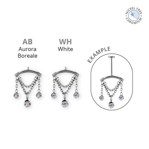 Amélie is een stijlvolle piercing met drie kettinkjes van kobalt chroom of met 24k gelaagd goud. Afgewerkt met fonkelende zirkonia.
