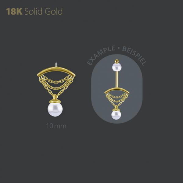 De Arc de Perle is een verfijnd piercingtopje van 18k massief goud, speciaal ontworpen voor een verticale helix. Dit sieraad heeft een internally threaded sluiting voor een stevige bevestiging op je piercing post en meet ongeveer 10 mm in breedte. Onder de elegante boog hangen fijne gouden kettinkjes die samenkomen in een bungelende zoetwaterparel. Daardoor ontstaat een sierlijk silhouet dat beweging en luxe combineert. Het ontwerp volgt de lijn van de verticale helix en vormt zo een opvallend maar elegant detail in je oor.