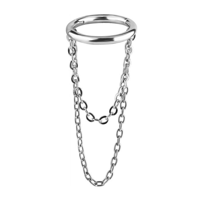 De Chained to the Rhythm clicker combineert strak design met een opvallend speels detail: de lange kettingen die elegant vanaf de ring naar beneden vallen. Dit sieraad trekt direct de aandacht en geeft je helix of lobe een uitgesproken karakter.