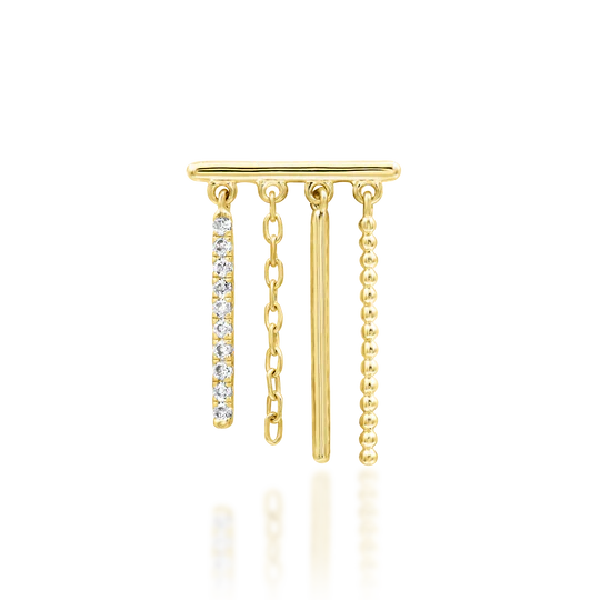 De Chime is een 14 karaat gouden piercing met zirkonia is een echte eyecatcher voor wie van luxe én beweging houdt. Dit bijzondere ontwerp bestaat uit een horizontale bar met daaraan vier verschillende hangers: een sprankelende rij cubic zirkonia, een elegante ketting, een gladde gouden bar en een subtiel beaded staafje. Samen zorgen ze voor een speels en toch stijlvol geheel.