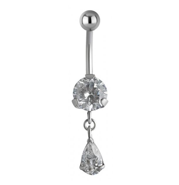 De Cry Me A Crystal navelpiercing is een echte blikvanger. Het design combineert een klassieke barbell met een fonkelende cubic zirkonia in klauwzetting. Daaronder hangt een druppelvormige steen die bij elke beweging extra glans geeft. Het resultaat is een sieraad dat luxe en speelsheid perfect in balans houdt.