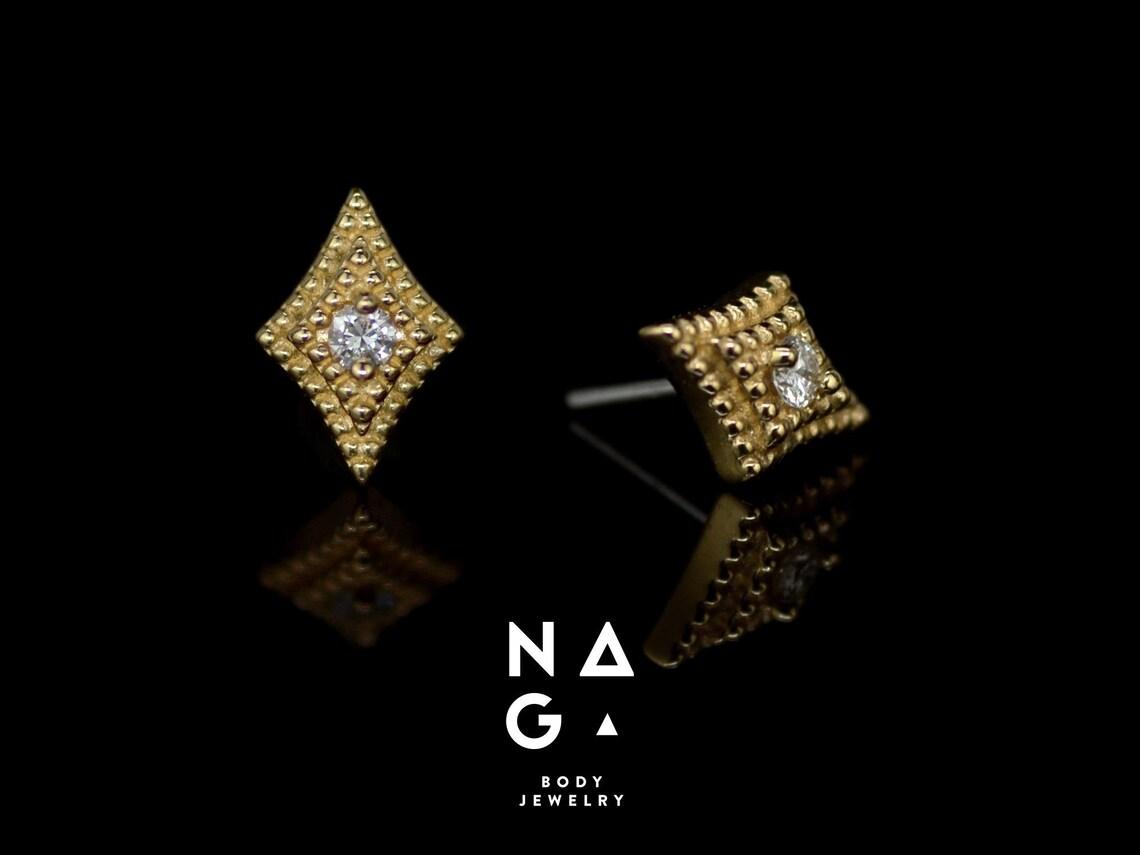 Dayama van NAGA – 18k massief gouden piercing top met witte diamant. 6.6mm lang, 4.7mm breed, threadless sluiting.