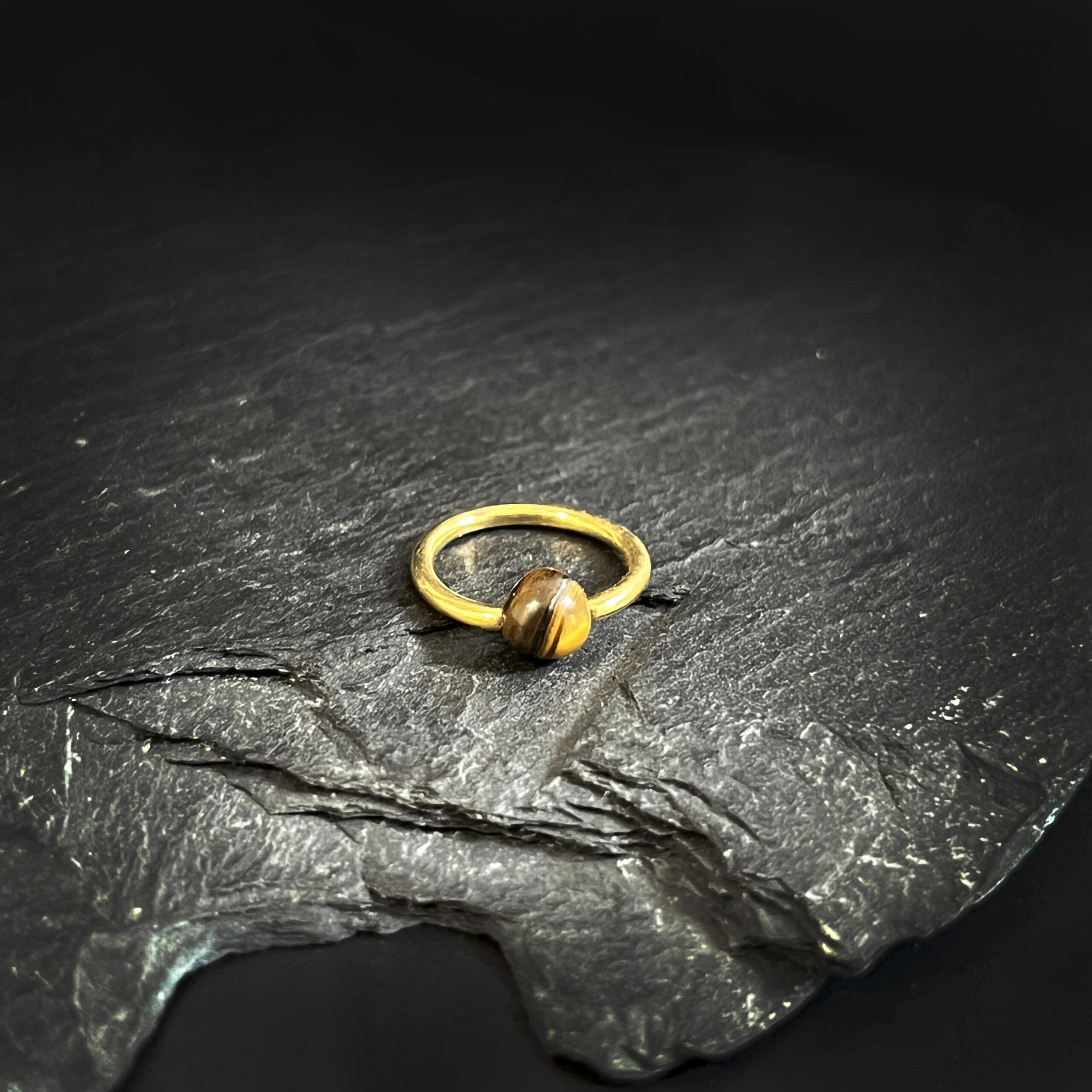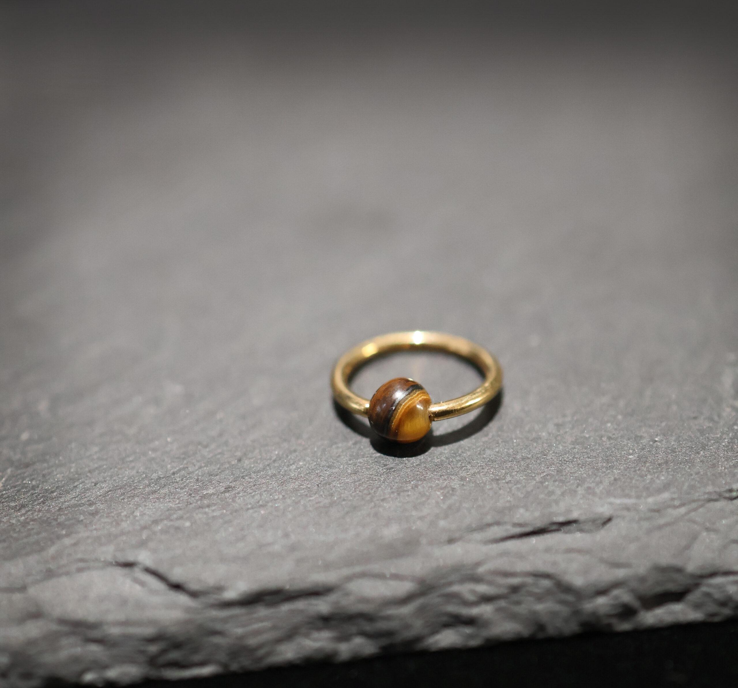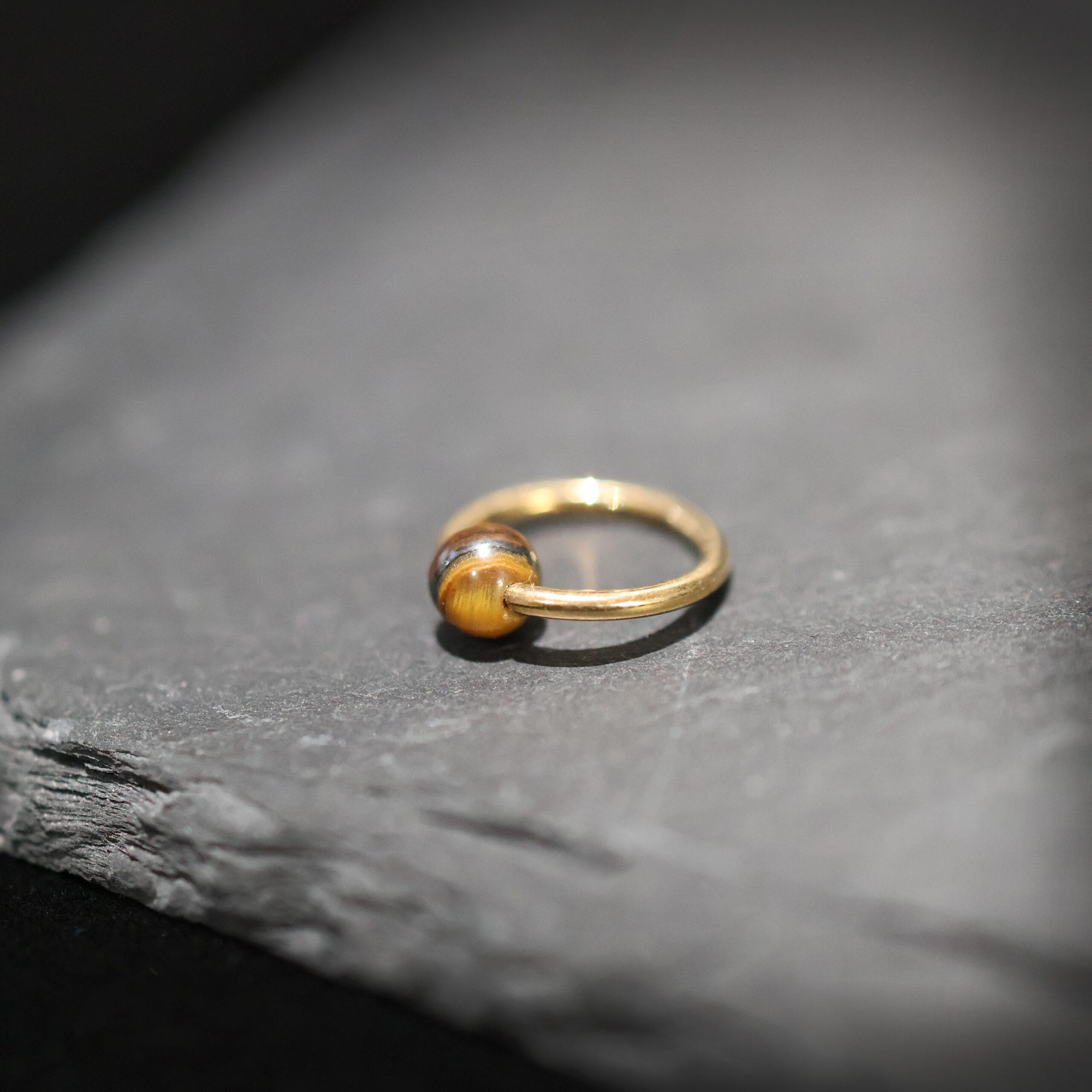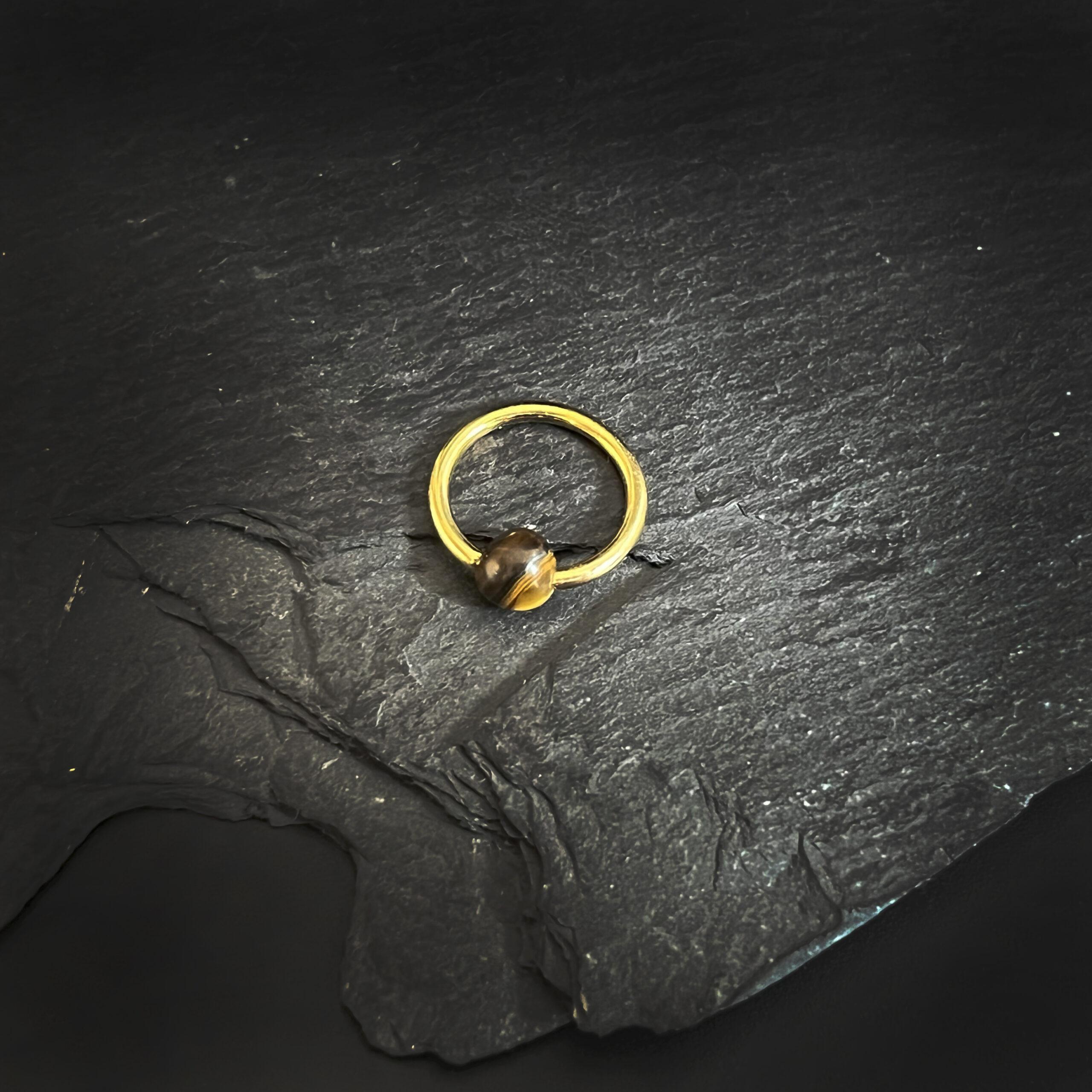 Eye of the Tiger – 18 karaat gouden piercing ring met Tijgeroog. Ball closure ring van 9 mm, stoer én elegant.