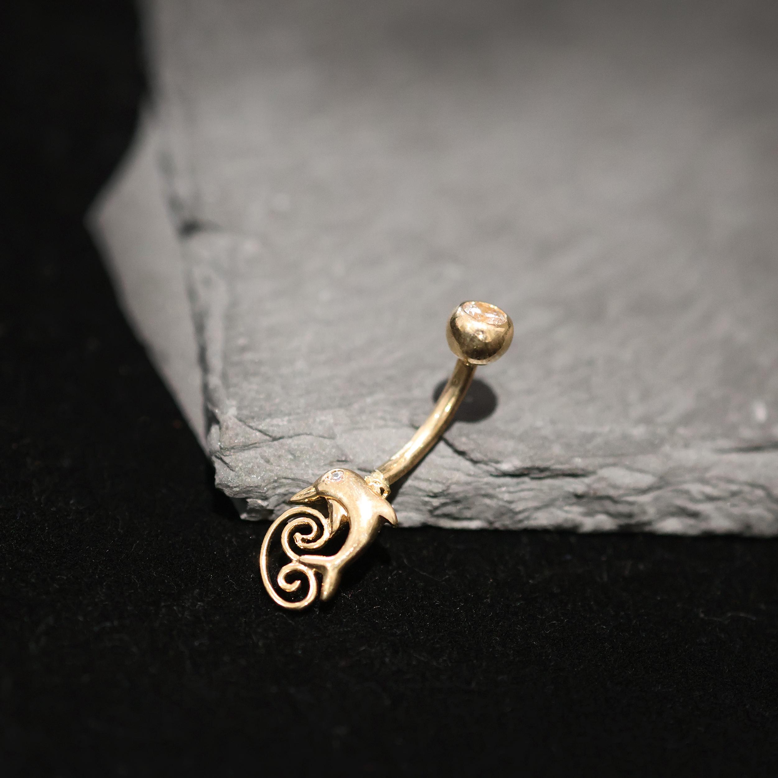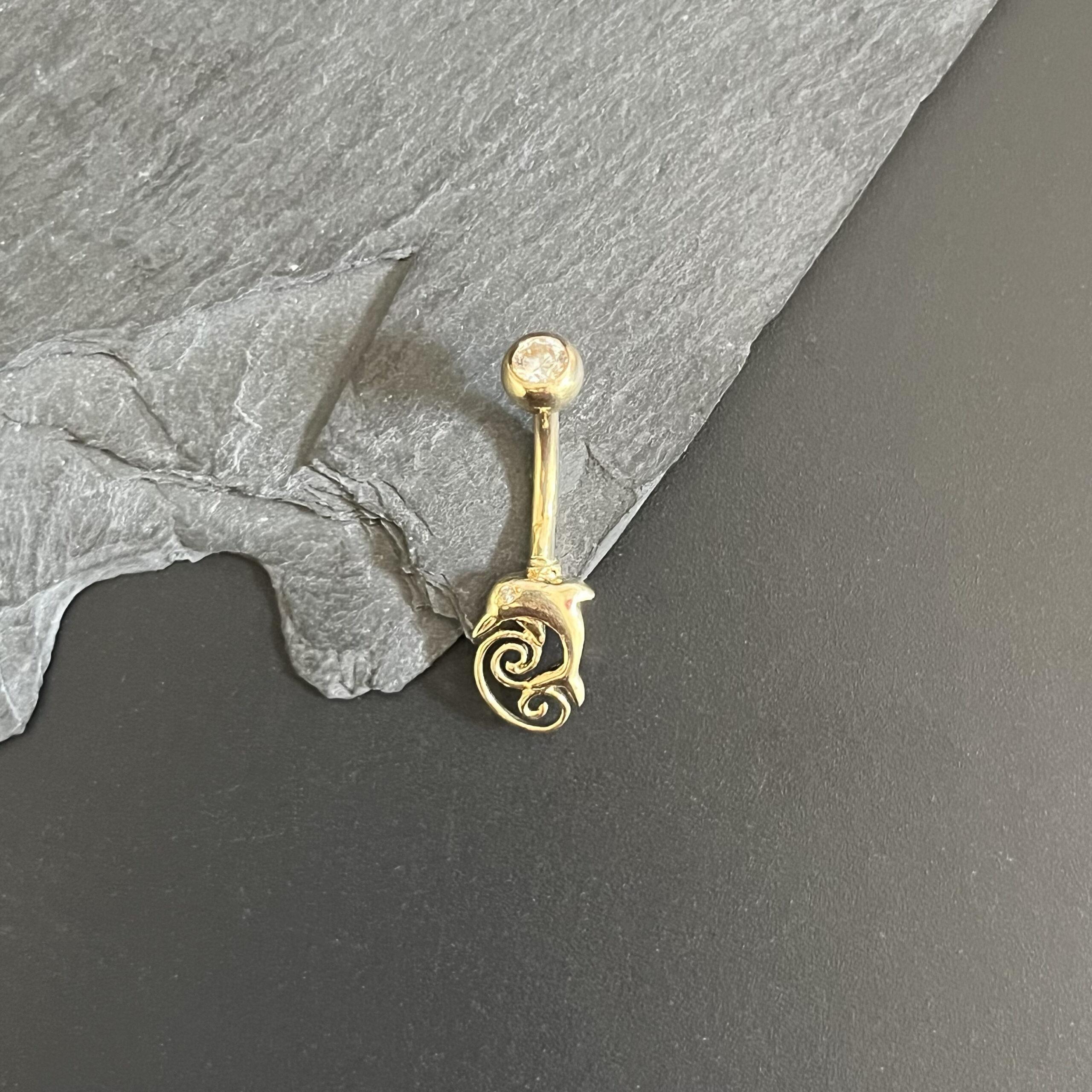Fishin’ Gold brengt een speelse twist aan luxe. Deze navelpiercing van 18 karaat massief goud wordt gesierd door een sierlijke dolfijn onderaan, terwijl het bovenste balletje fonkelt met een witte zirkonia. Het resultaat is een sieraad dat klasse en fun moeiteloos combineert.