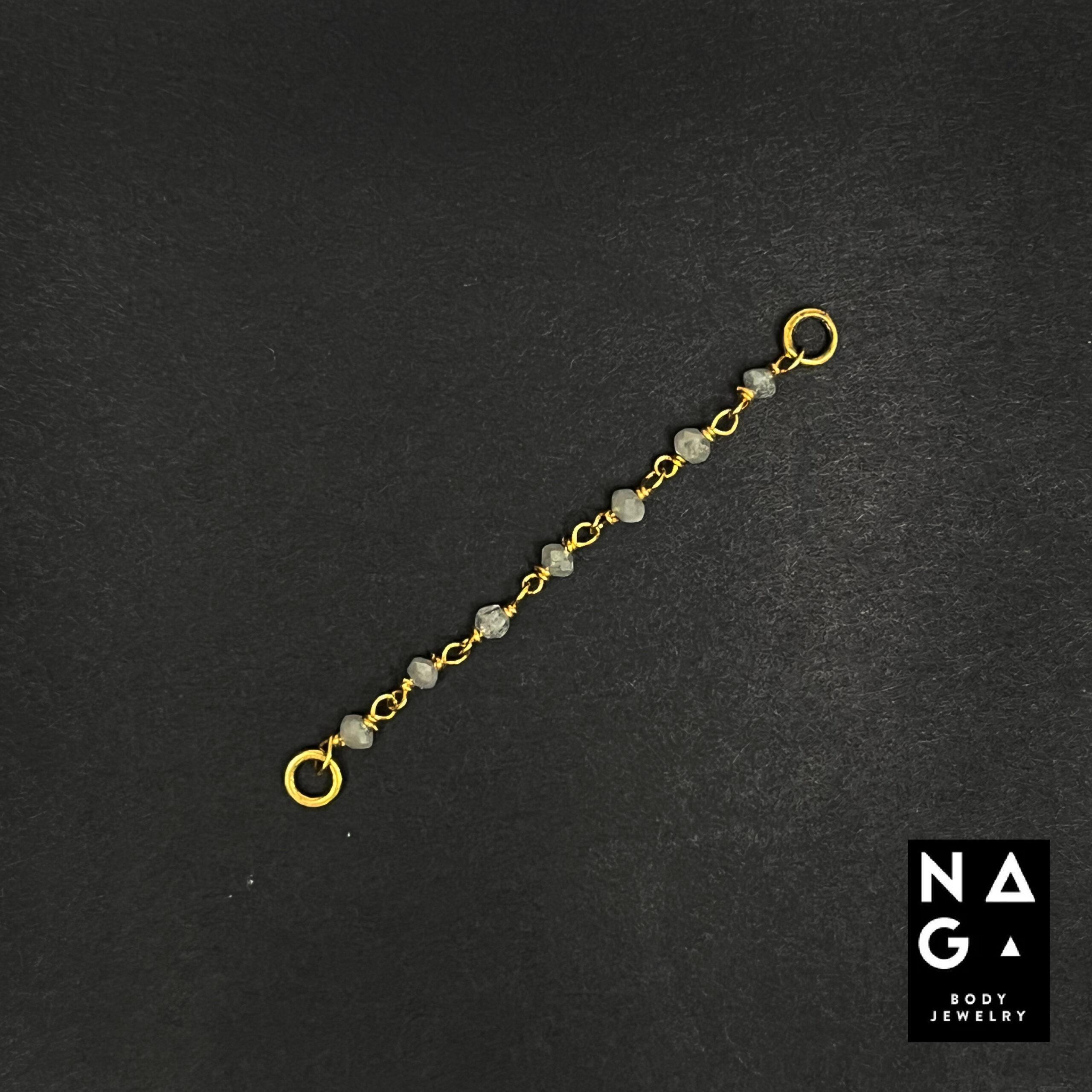 Glacia is een 20mm lange NAGA-piercingchain van 18k massief goud met ruwe witte diamantjes.