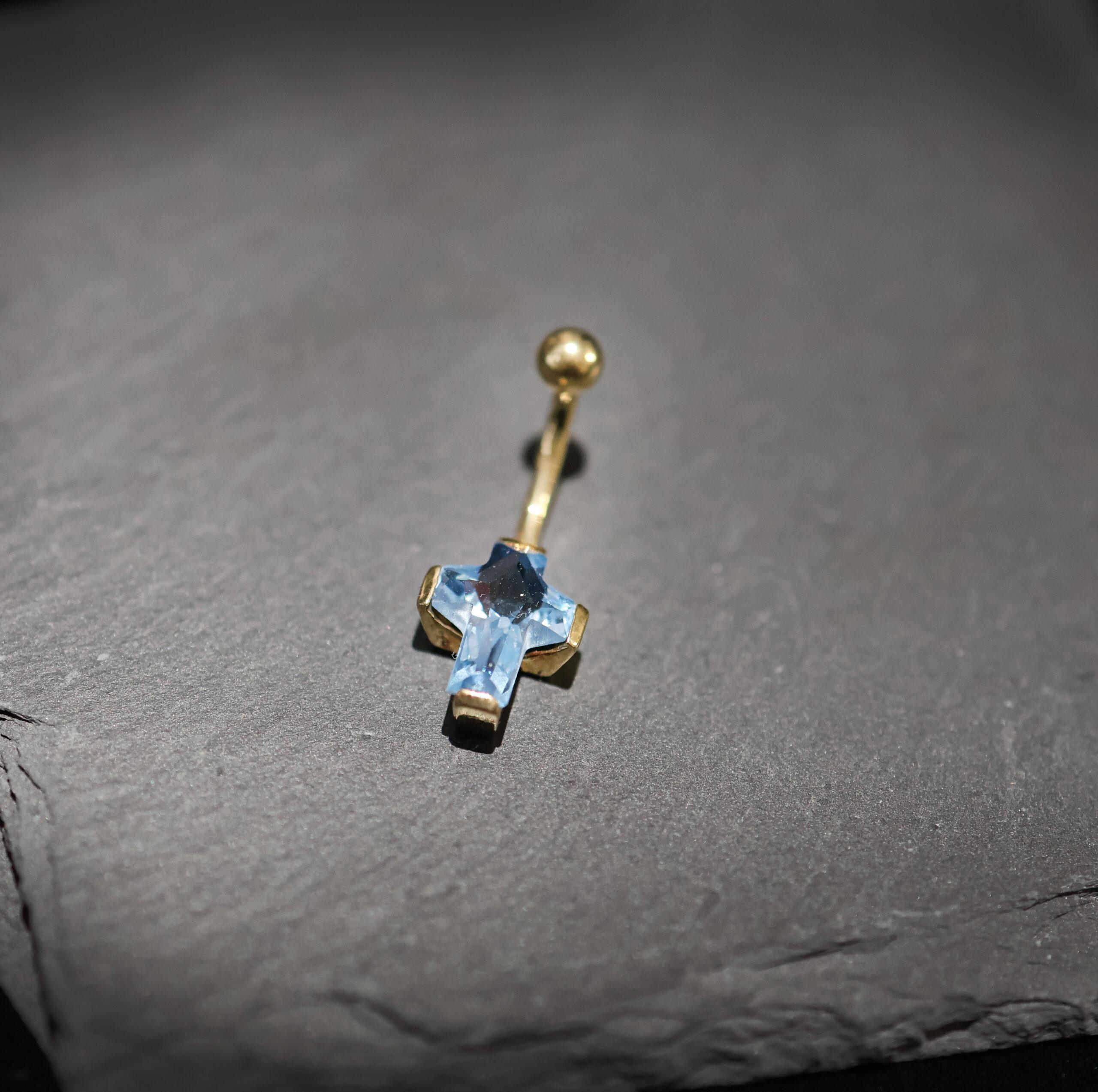 Holy Blue combineert spiritualiteit met een vleugje glamour. Deze navelpiercing van 18 karaat massief goud wordt gesierd door een opvallend kruis dat fonkelt met blauwe zirkonia. De koelblauwe tint geeft het sieraad een frisse, mystieke glans die prachtig contrasteert met het warme goud.