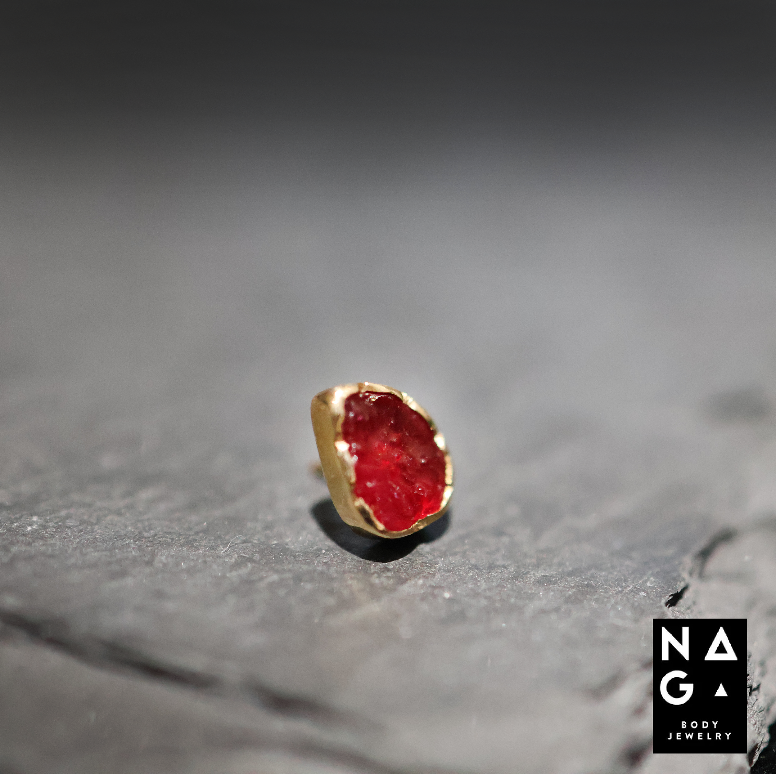 Kala is een ode aan tijd, vuur en transformatie. Deze piercingtop van NAGA bevat een echte robijn, gevangen in een zetting van 18 karaat massief goud. De steen is ongeslepen, rauw en levendig — een natuurlijke vorm die haar eigen pad heeft gevolgd. Het goud vloeit eromheen als gesmolten zon, zacht golvend, alsof het zich naar de robijn heeft gevormd in plaats van andersom.
