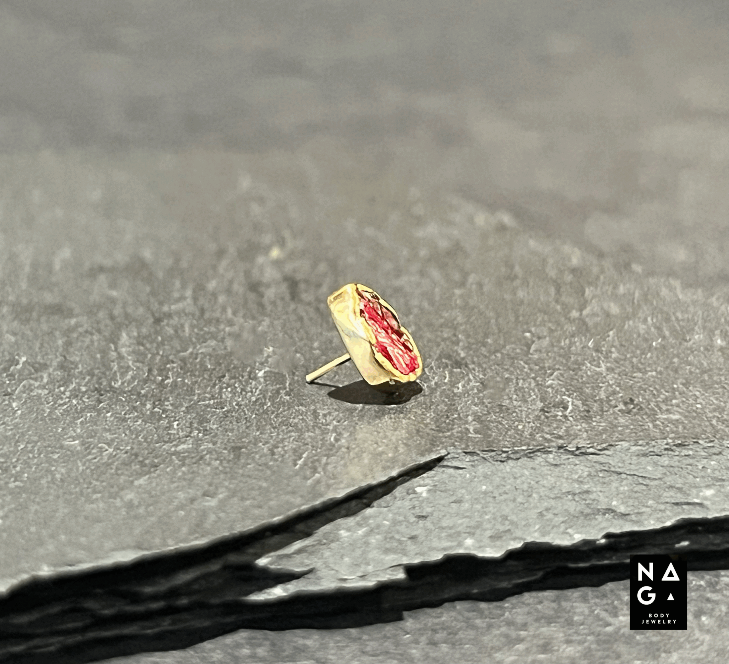 Kala van NAGA — echte robijn in 18k massief goud, threadless sluiting, lengte; 7.2mm, breedte; 5.8 mm. One of a kind.