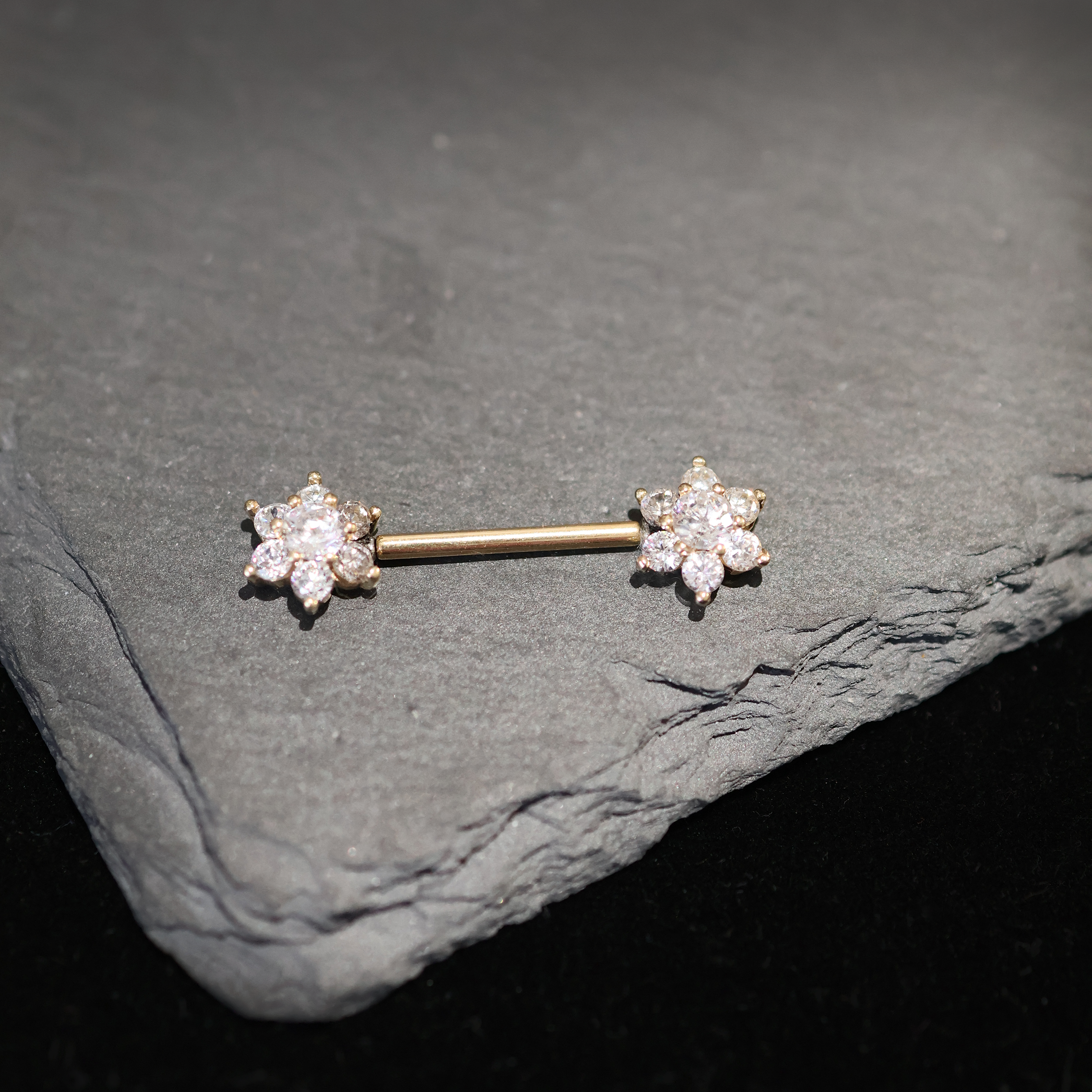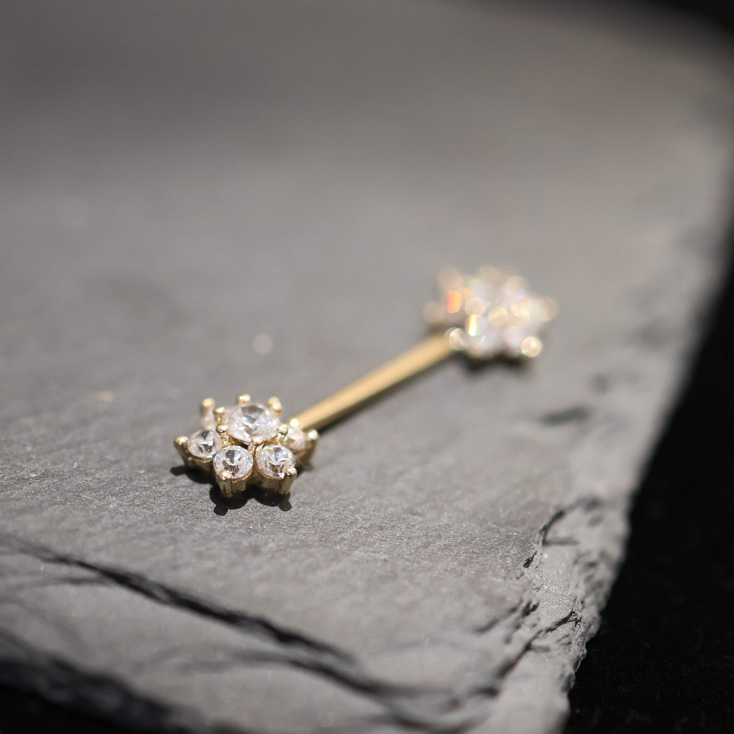 Khyra is een tepelpiercing die balans brengt tussen verfijning en uitgesproken design. De dubbele bloemtopjes zijn gemaakt van 14 karaat massief goud en opgebouwd uit zorgvuldig geplaatste zirkonia steentjes. De diameter van 10mm geeft het design een duidelijke presence, terwijl de symmetrie het geheel strak en gecontroleerd houdt. De barbell is vervaardigd uit titanium met 18 karaat gelaagd goud, met een staafdikte van 1.6mm en verkrijgbaar in 14mm, 16mm of 18mm.
