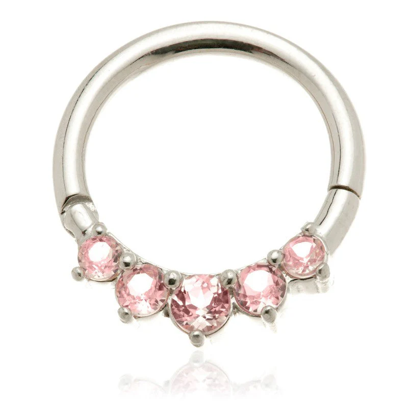 De front-facing plaatsing laat de saffieren direct naar voren kijken. Daardoor blijft Lira perfect zichtbaar in een daith of septum. De vorm voelt klassiek, maar de roze tint geeft haar een moderne twist. Lira brengt zachtheid zonder fragiel te worden. Ze draagt luxe met een duidelijke attitude.