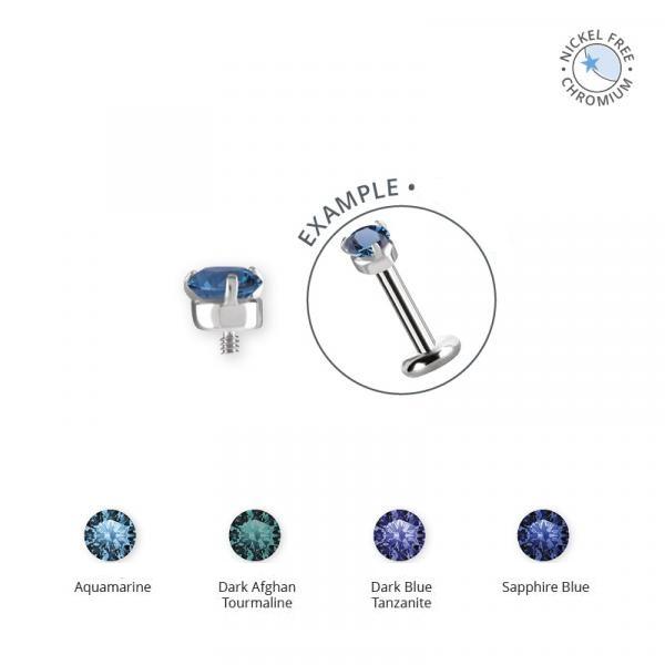 Lustré piercing top van kobalt chroom of 18k gelaagd goud, met zirkonia (aquamarine, tourmaline, tanzanite of saffier), 3mm, internally threaded 0.8mm.