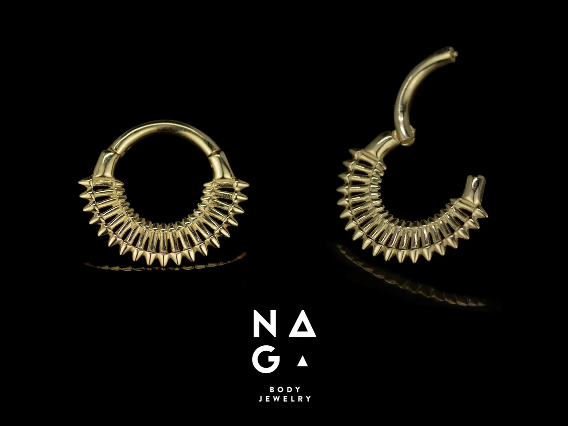 De ritmische structuur doet denken aan tandwielen en pantser – maar in goud gegoten, krijgt dat industriële karakter een onverwacht raffinement. Mekanis is niet voor de brave drager: dit is sierkunst die spreekt in vormen, niet woorden. Een statement dat net goed past in een septum of daith, maar ook bij is in een mid-helix of lobe.