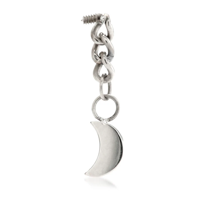 Moonchain combineert kosmische vibes met een stoere uitstraling. Deze piercing top is gemaakt van hoogwaardig titanium en heeft een bungelend kettinkje met een halve maan hanger. Dankzij de internally threaded sluiting is hij stevig en comfortabel te dragen.