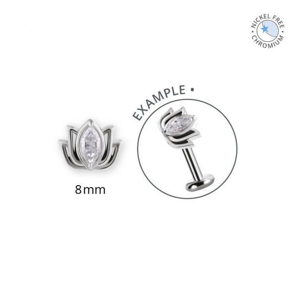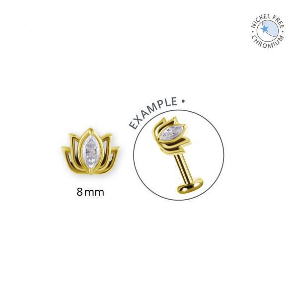 Nirva-na-yeah! is een piercingtop van kobalt chroom of 18k PVD goud op kobalt chroom, met premium zirkonia, internally threaded 0,8 mm (voor 1,0 en 1,2 mm posts), lotusontwerp, 8 mm groot.