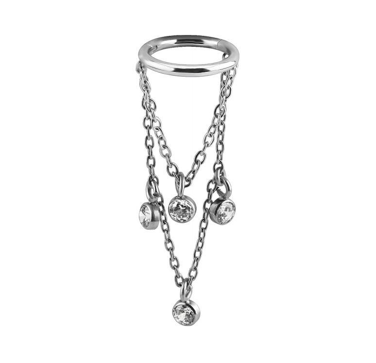 Het echte blikvanger-effect komt van de ketting-drip. Meerdere fijne kettinkjes vallen elegant vanaf de ring naar beneden en bewegen mee bij elke stap. De zirkonia steentjes geven net genoeg sparkle zonder overdreven te zijn. Draag je hem in je helix, dan vallen de kettinkjes speels langs je oor en creëren ze een dancing drama effect dat meteen opvalt.