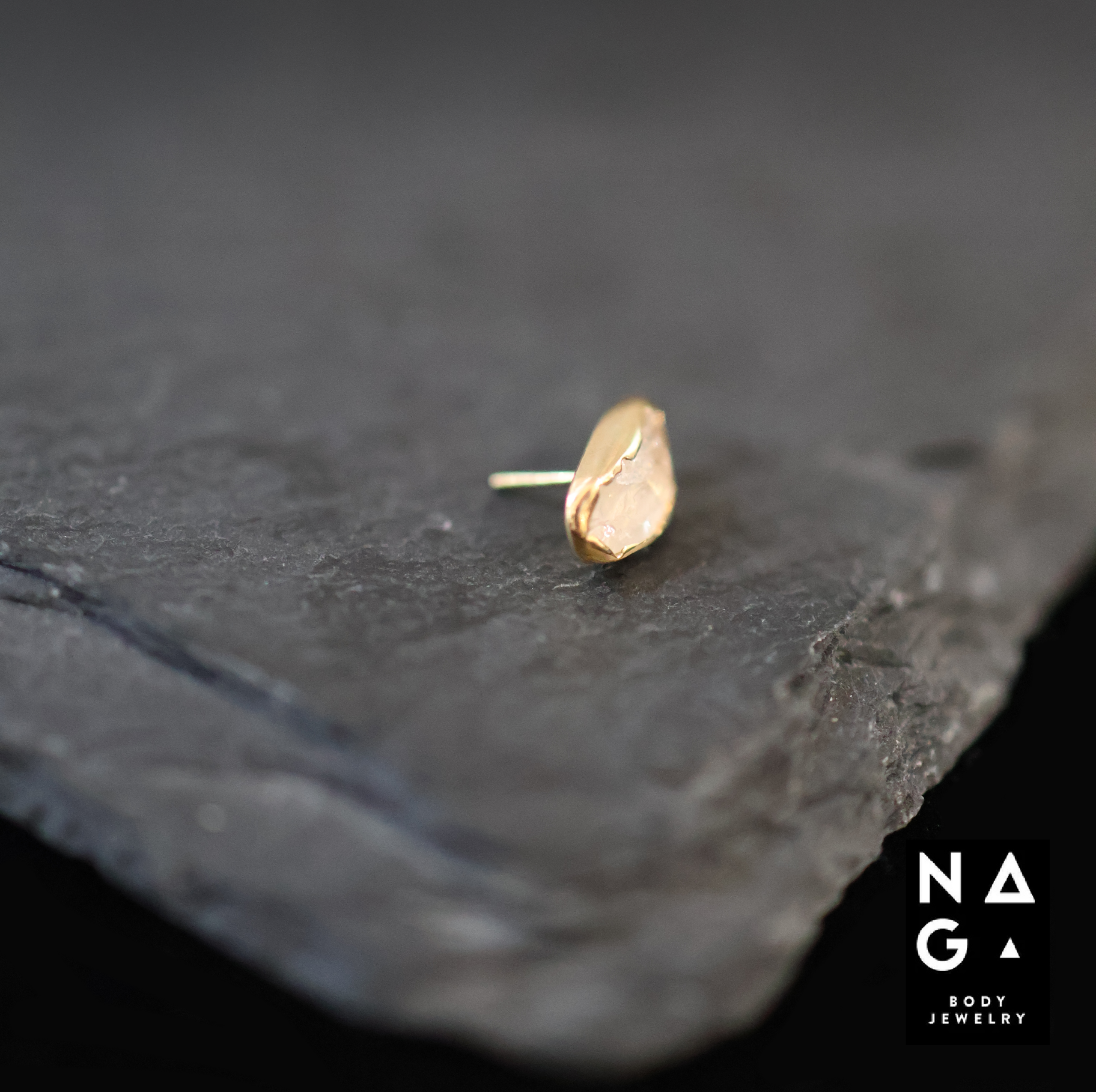Met een lengte van 4.1 mm en een breedte van 8.5 mm is Noora delicaat, maar vol aanwezigheid. De threadless sluiting zorgt voor een strakke afwerking zonder concessies aan comfort. Elk exemplaar is one of a kind — geen twee stenen zijn ooit hetzelfde.