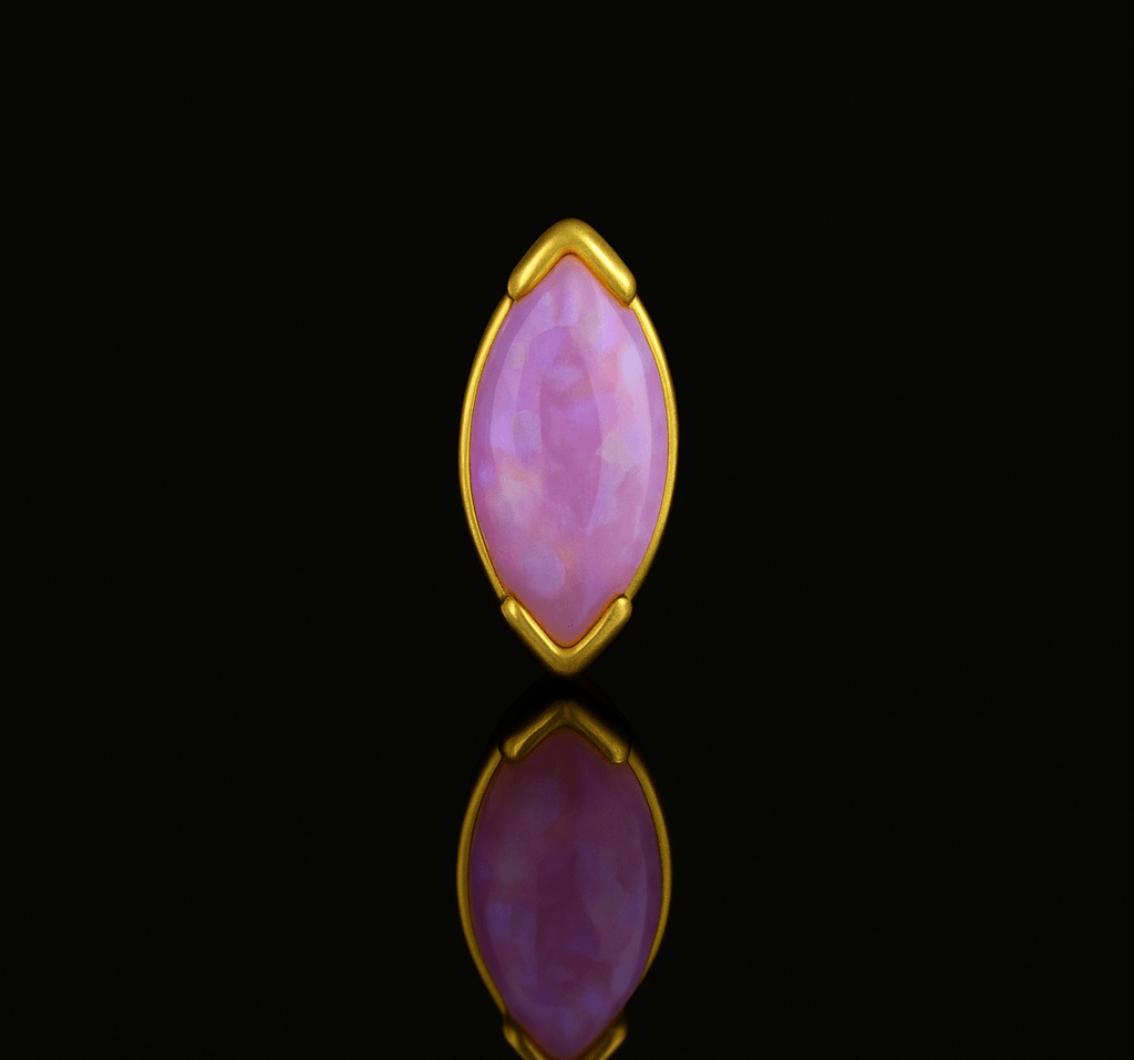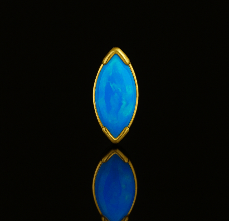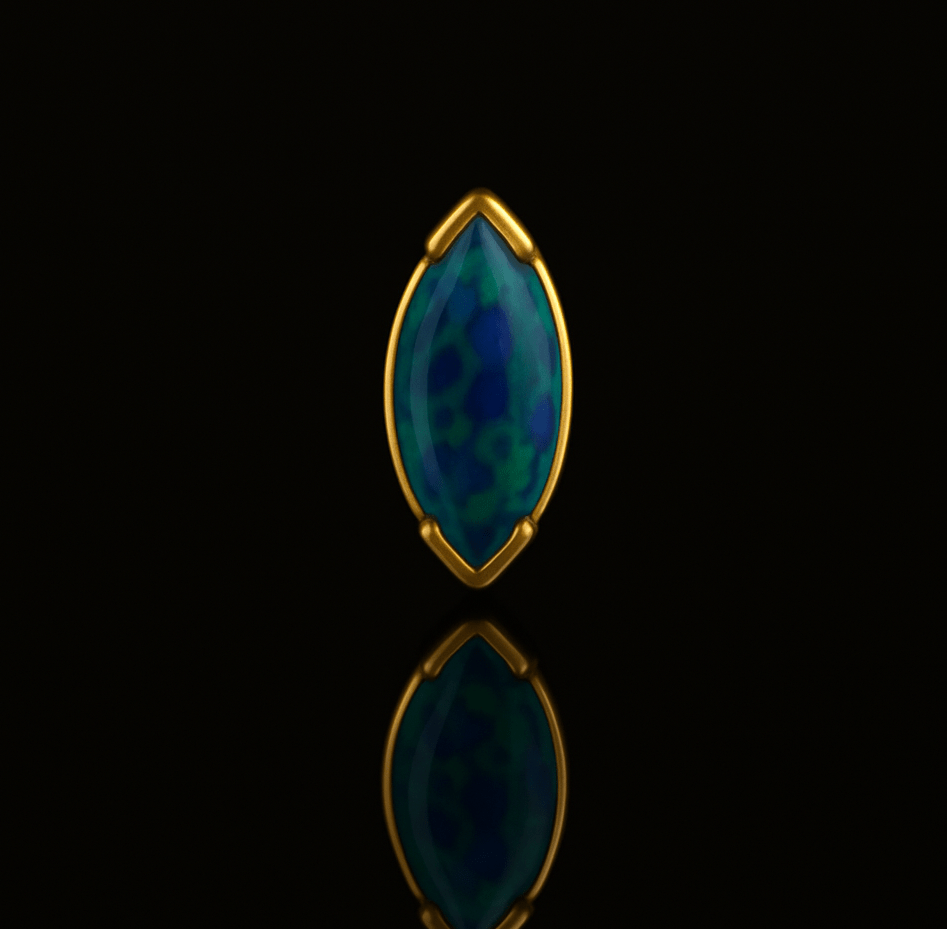 Polychroma laat elke piercing opvallen met een levendig, veelkleurig karakter. Deze marquise-vormige top is gemaakt van 18k massief goud en gevuld met lab-gemaakte opaal in vijf varianten: black, paraiba, roze, blauw saffier en wit. De afmetingen zijn 6mm lang en 2.7mm breed. Daardoor krijgt Polychroma een elegante, slanke vorm die je look direct verfijnt. De steen toont zachte kleurverschuivingen die veranderen wanneer je beweegt. Dat geeft het sieraad die kenmerkende, veelkleurige aura.