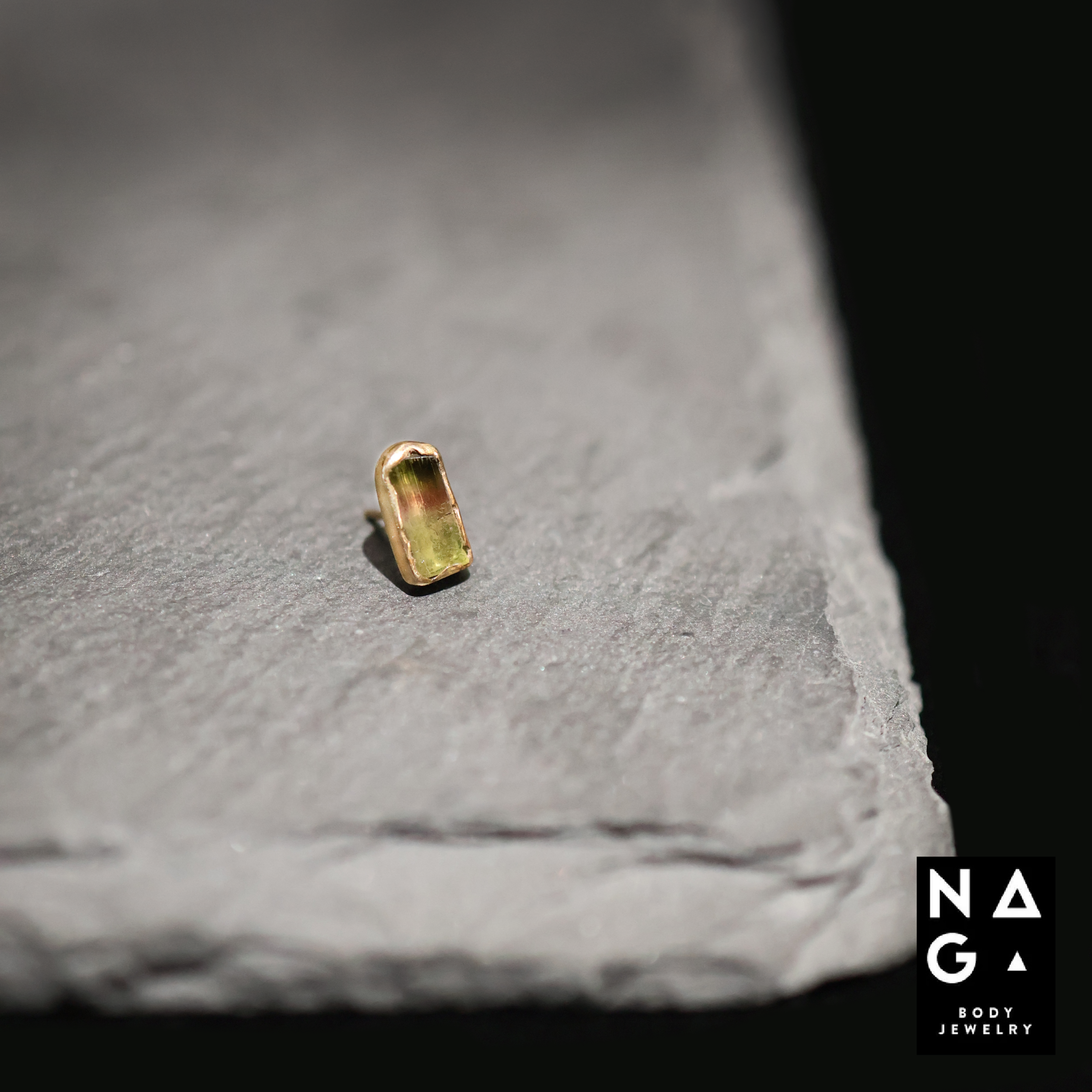 Rhéa belichaamt de kracht van balans en de schoonheid van natuurlijke perfectie. In dit unieke NAGA-stuk rust een echte watermeloen-toermalijn, gevangen in een zetting van 18 karaat massief goud. De langgerekte steen van 7.3 mm lang en 3.9 mm breed wordt omarmd door goud dat vloeiend rond haar randen lijkt te zijn gestold. De warme glans van het goud versterkt de overgang van zachtroze naar frisgroen — een kleurverloop dat alleen in echte watermeloen-toermalijn voorkomt.