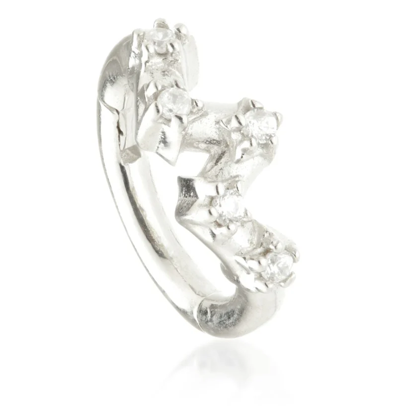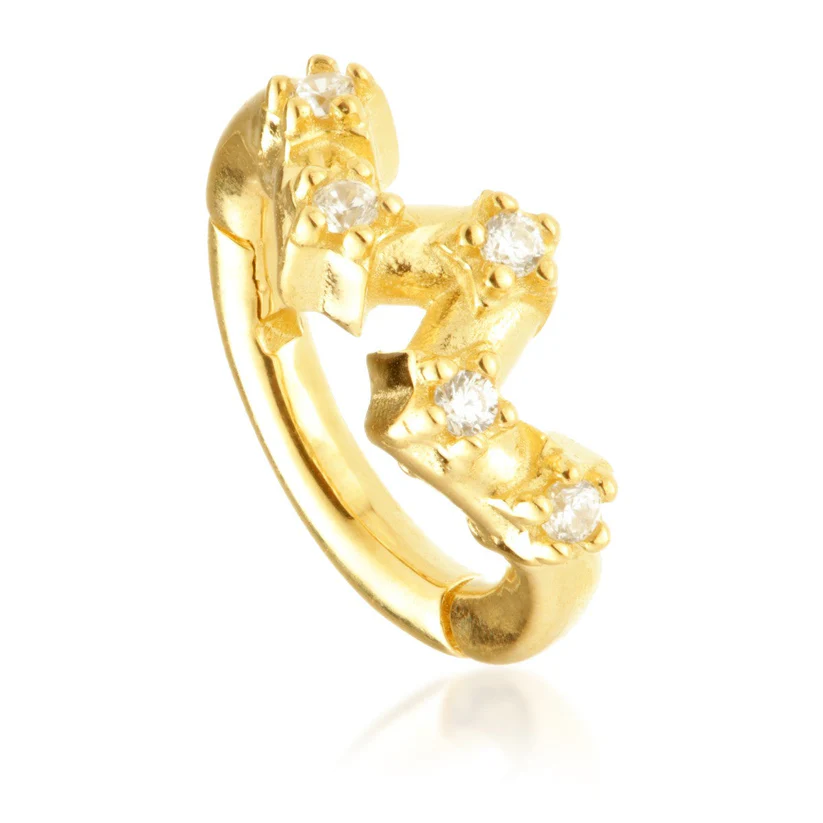 Ripple brengt beweging in je curatie. De 14k massief gouden clicker heeft een opvallende, zig-zag vorm. De vorm voelt alsof hij is gegoten in een vloeiende beweging. Daardoor krijgt Ripple een organische uitstraling met een moderne twist. De vijf witte cubic zirkonia liggen verspreid over de curve. Dat geeft verschillende lichtaccenten over de hele vorm. De staaf dikte van 1.2mm maakt Ripple geschikt voor veel piercings.