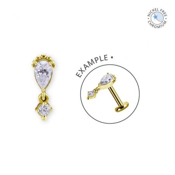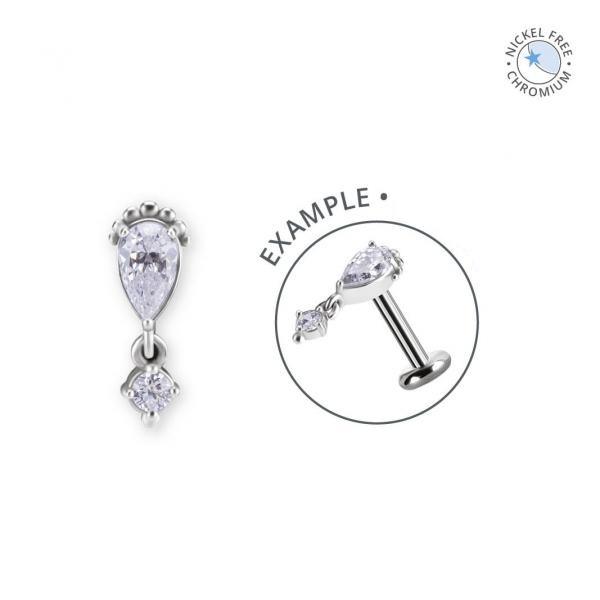 Royal Rain piercing top van hypoallergeen kobalt chroom of 18k gelaagd goud op kobalt chroom met premium zirkonia, internally threaded 0.8 mm, 11 mm lang – voor conch, flat, lobe, helix of (faux-)rook.