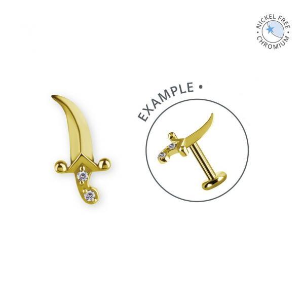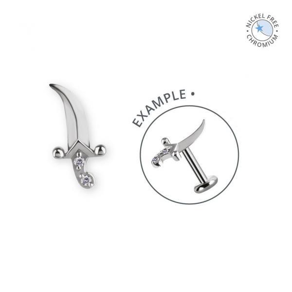 Scimitar is een gedurfde piercing top gemaakt van hypoallergeen kobalt chroom of met 18 karaat gelaagd goud op kobalt chroom. Dit materiaal is nikkelvrij en veilig voor gevoelige huid. De top is 11 mm lang en heeft een internally threaded 0.8 mm sluiting voor stevig en comfortabel dragen.