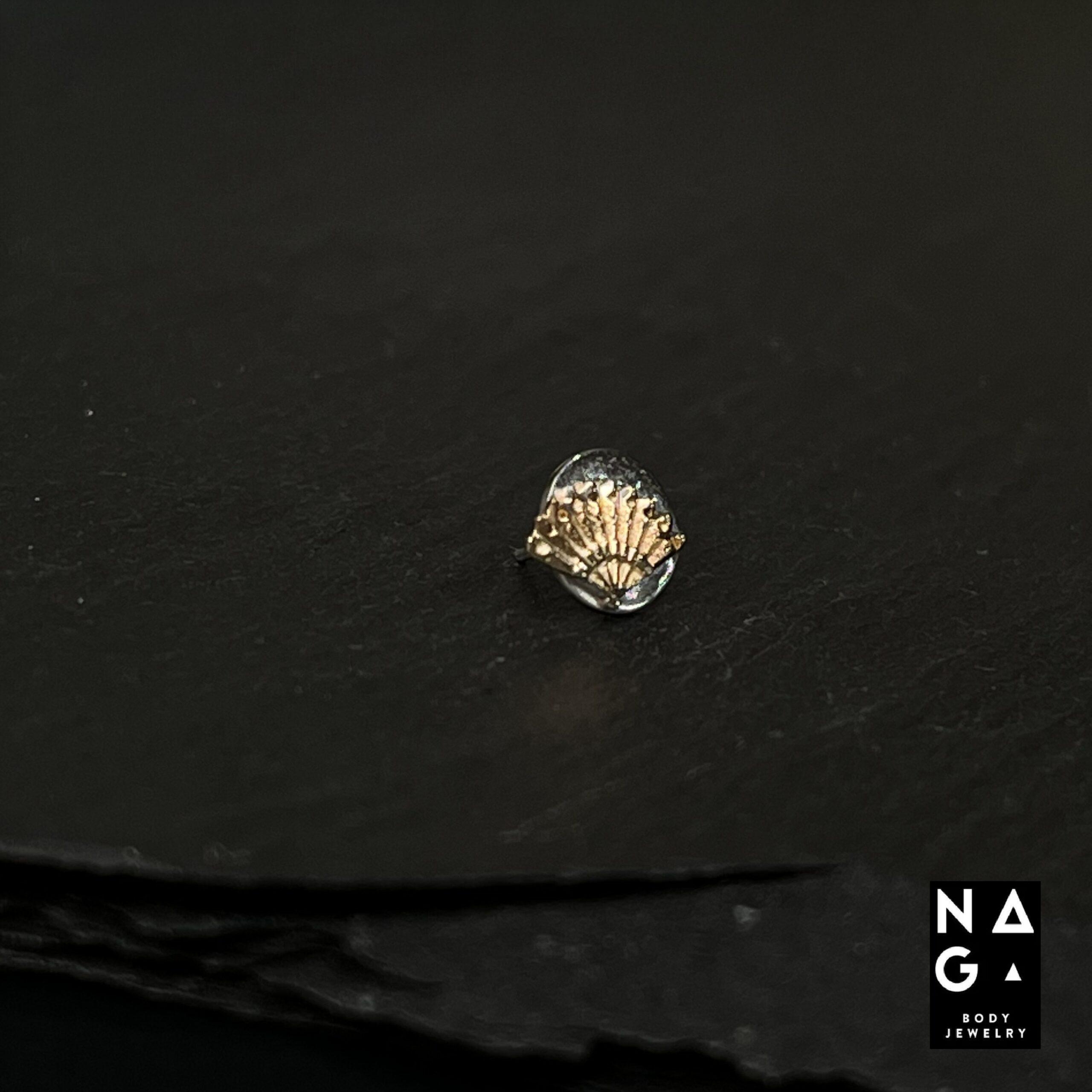 Sensu disk is een 14k massief gouden threadless piercing top van 7,5 × 6 mm met een waaiervormig design.