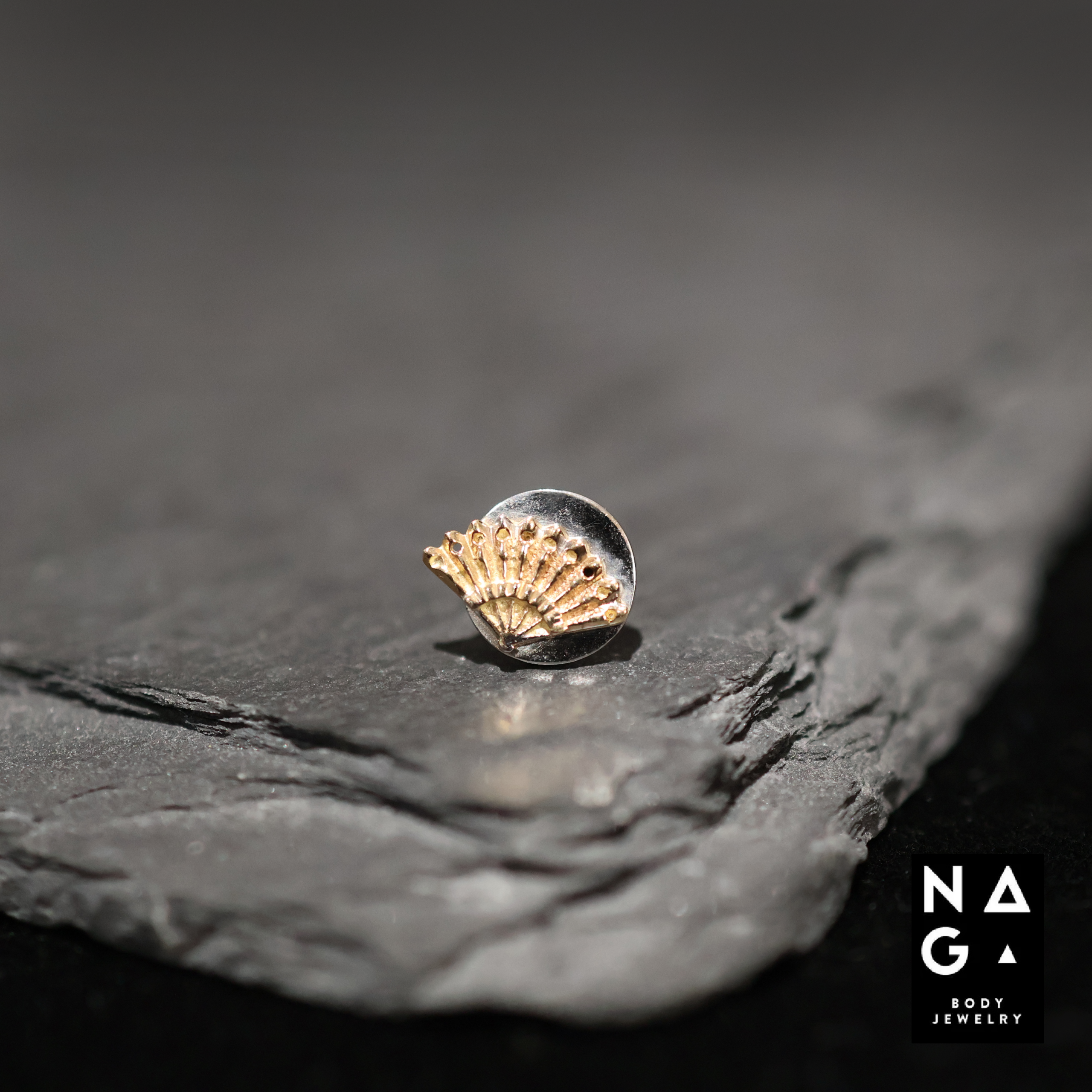 Sensu disk laat de typische NAGA-architectuur zien: luxe met een duidelijke ruggengraat. Dit topje is gemaakt van 14k massief goud en heeft een breedte van 7,5 mm en een lengte van 6 mm. Het ontwerp bestaat uit een ronde schijf met daarop een waaiervormige structuur. Die waaier verwijst subtiel naar de Japanse sensu-waaier. Daardoor voelt het sieraad als een klein ceremonieel object. De gouden lijnen lopen scherp naar buiten. De details geven het ontwerp ritme en beweging. Zo ontstaat een krachtig maar rustig centrum.