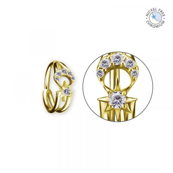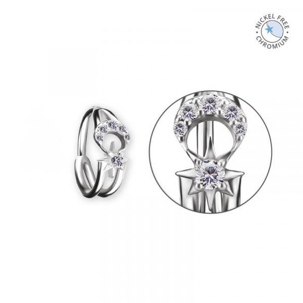 Het ontwerp van Aurum combineert een sierlijke maanvorm met een subtiele ster, gezet met fonkelende premium zirkonia. De glanzende steentjes creëren een celestial vibe en geven je piercing een opvallend en toch verfijnd accent. Zo krijgt jouw conch, helix of lobe meteen een kosmisch tintje zonder overdadig te worden.