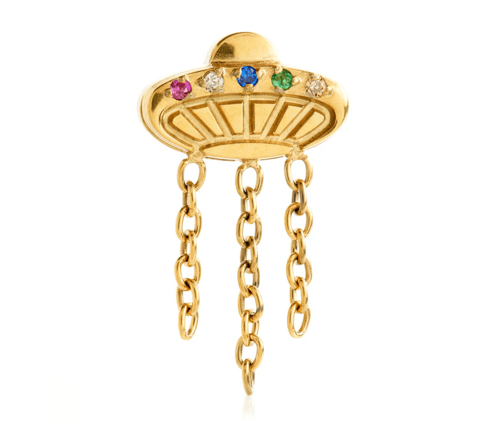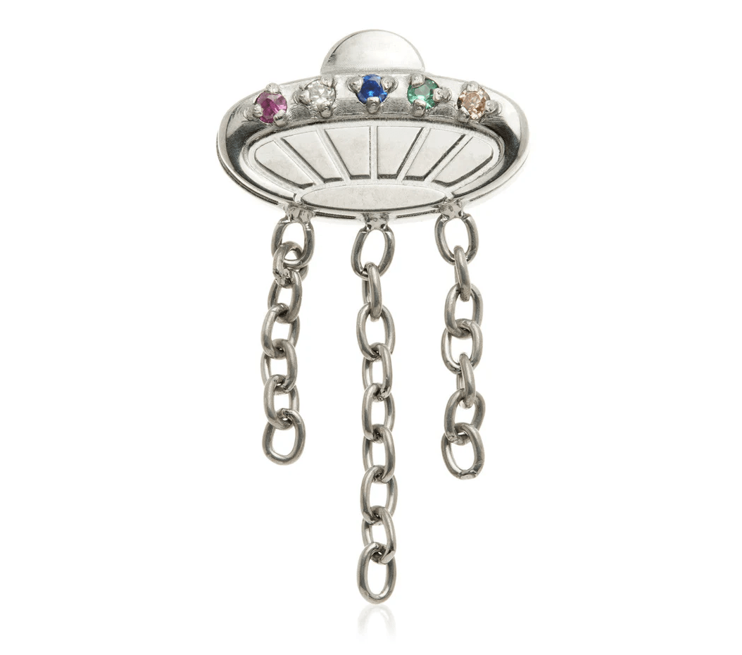 De Starlight Saucer is een piercing die letterlijk out of this world is. Dit unieke design combineert een futuristische UFO-vorm met sprankelende zirkonia in meerdere kleuren, waardoor je oor een kosmische vibe krijgt. De bungelende kettinkjes versterken het speelse en opvallende karakter van dit sieraad.