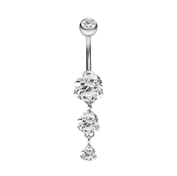 The Dangle navelpiercing van chirurgisch staal, 24 karaat gelaagd goud of roségoud, met drie steentjes (8/6/4 mm), staafdikte 1.6 mm, staaflengte 8 of 10 mm.