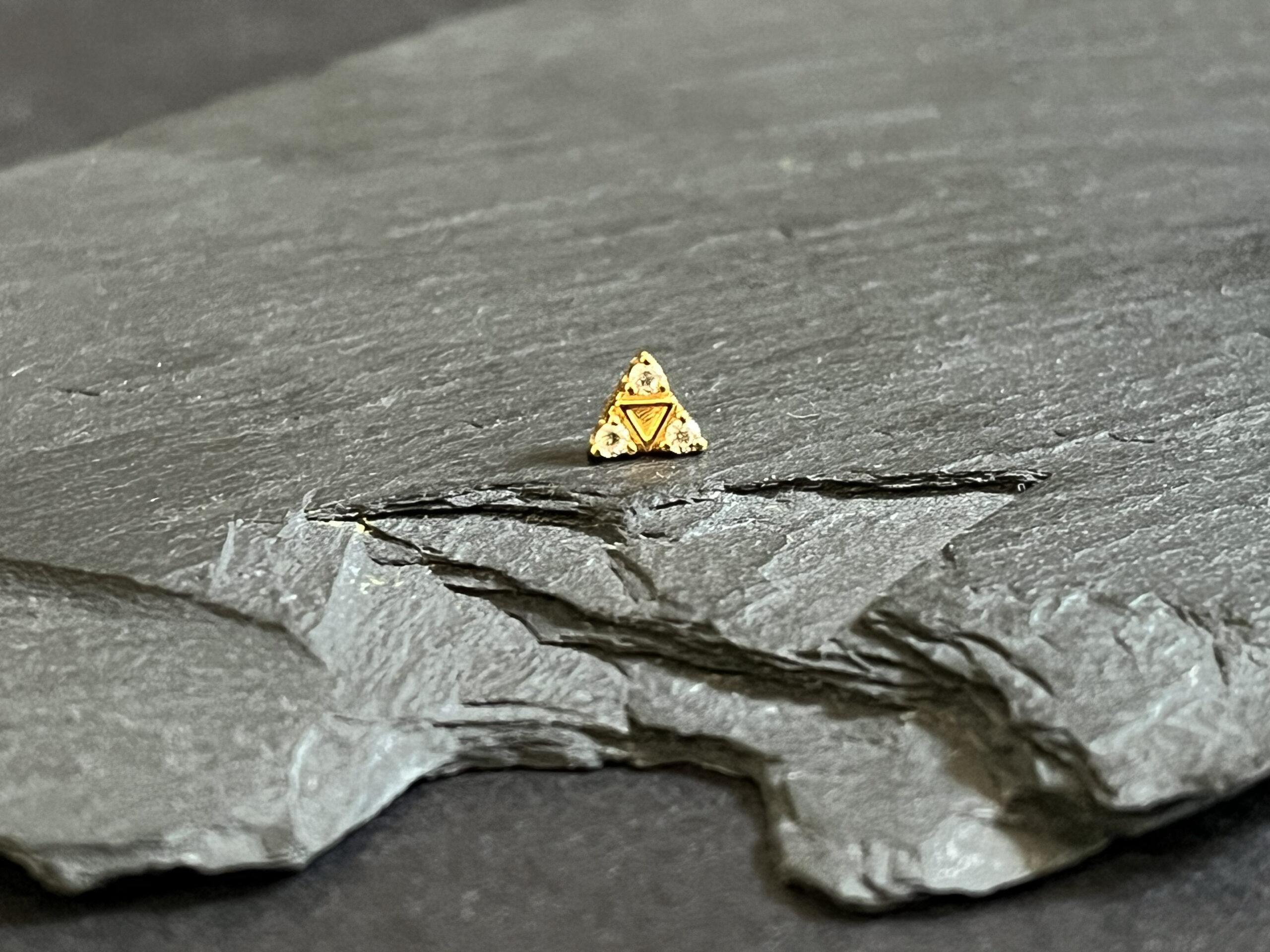 Trezza is geometrie met betekenis. Deze piercingtop is gemaakt van 18 karaat massief goud en bezet met sprankelende cubic zirkonia. De driehoekvorm symboliseert balans, richting en de verbinding tussen lichaam, geest en energie. Een oud symbool, opnieuw vormgegeven in moderne luxe.