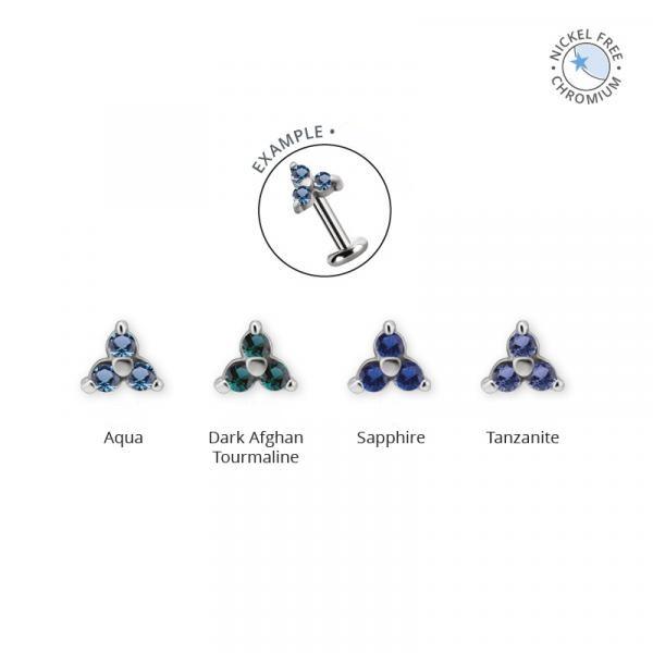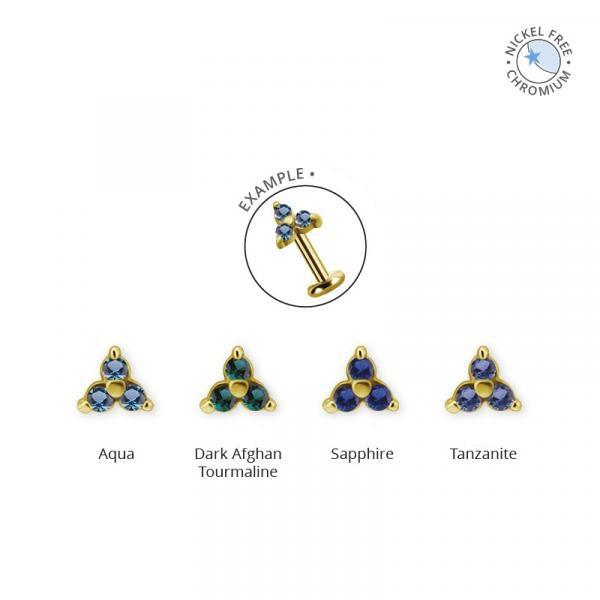 Trietta piercingtop van kobalt chroom of 18k gelaagd goud, 4 mm, internally threaded 0.8 mm, verkrijgbaar met Aquamarine, Dark Afghan Tourmaline, Saffier en Tanzanite zirkonia.