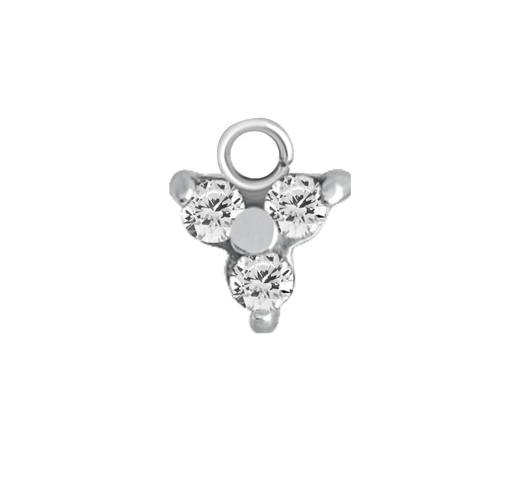 Trois Mini is een hanger van chirurgisch staal of met 24k gelaagd goud met drie cubic zirkonia. Lengte 3mm, breedte 3.5mm. Past op staafjes tot 1.6mm.