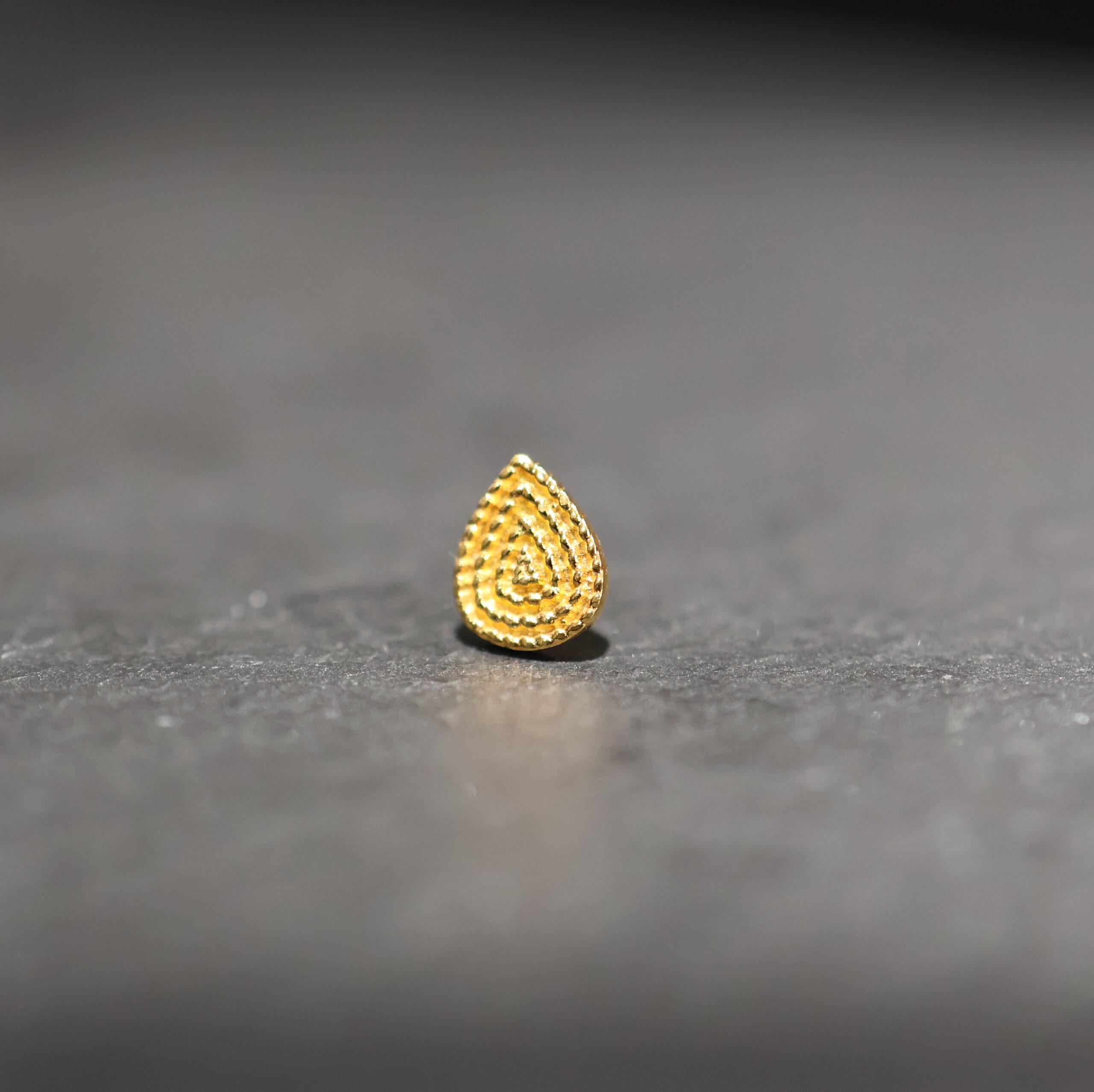 Véda belichaamt luxe met karakter. Dit topje van massief 18 karaat geelgoud heeft een vloeiende druppelvorm met een fijn reliëfpatroon dat het licht subtiel vangt. De structuur geeft diepte, textuur en een gevoel van elegantie zonder dat het te braaf wordt.